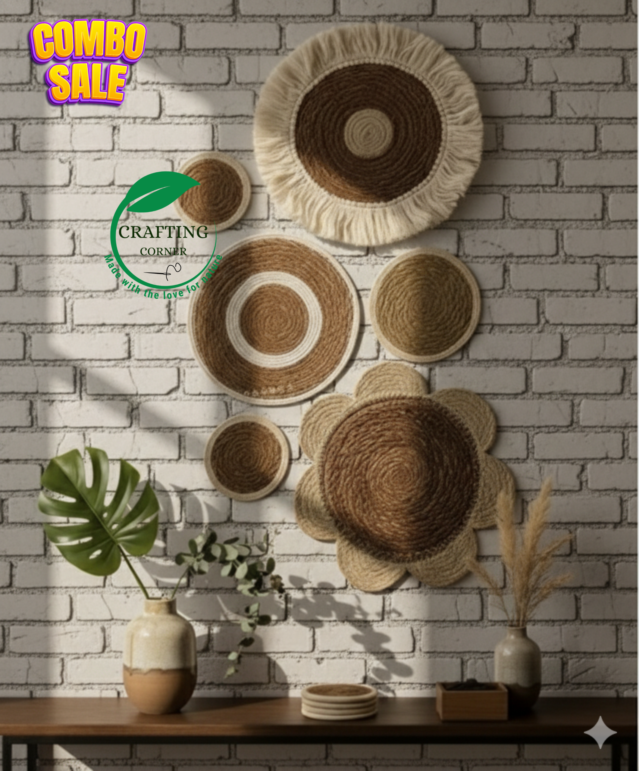 Description: Transform your space with texture! Our 6-Piece Crafting Corner Combo is the ultimate statement for the eco-conscious decorator. Made from 100% natural jute and seagrass, these versatile mats can be arranged in endless configurations to fit your unique style. Durable, lightweight, and ethically made—it’s time to give your walls the “natural” glow-up they deserve. 🌿